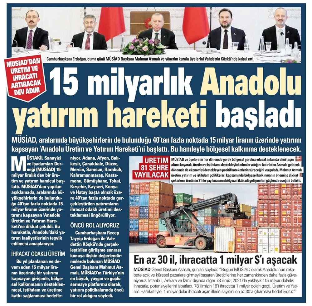 Müstakil Sanayici ve İşadamları Derneği (MÜSİAD), aralarında büyükşehirlerin de bulunduğu 40’tan fazla noktada 15 milyar liranın üzerinde yatırımı kapsayan "Anadolu Üretim ve Yatırım Hareketi"ni başlattı.